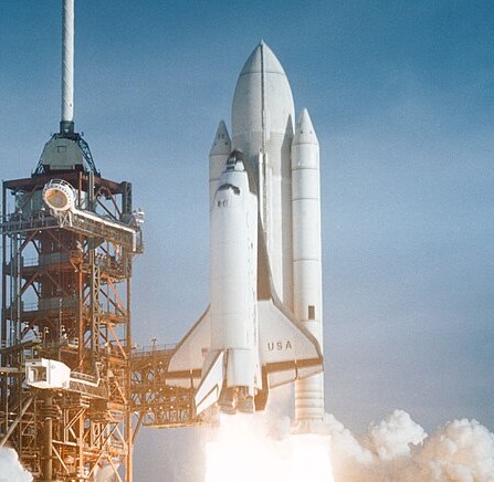 But there is something odd about the photo: everything — except the large missile-shaped object in the middle of the spacecraft — is white. That’s the external fuel tank — it is, basically, a big tank of rocket fuel, the contents of which are needed solely to get the shuttle into space. There’s nothing else in there. And, as you can see, it’s orange — a color you rarely see in consumer products, let alone massive, very visible scientific expeditions. And in fact, in the early space missions — such as STS-1 on April 12, 1981, the launch of which can be seen below, that same part was white. What gives?