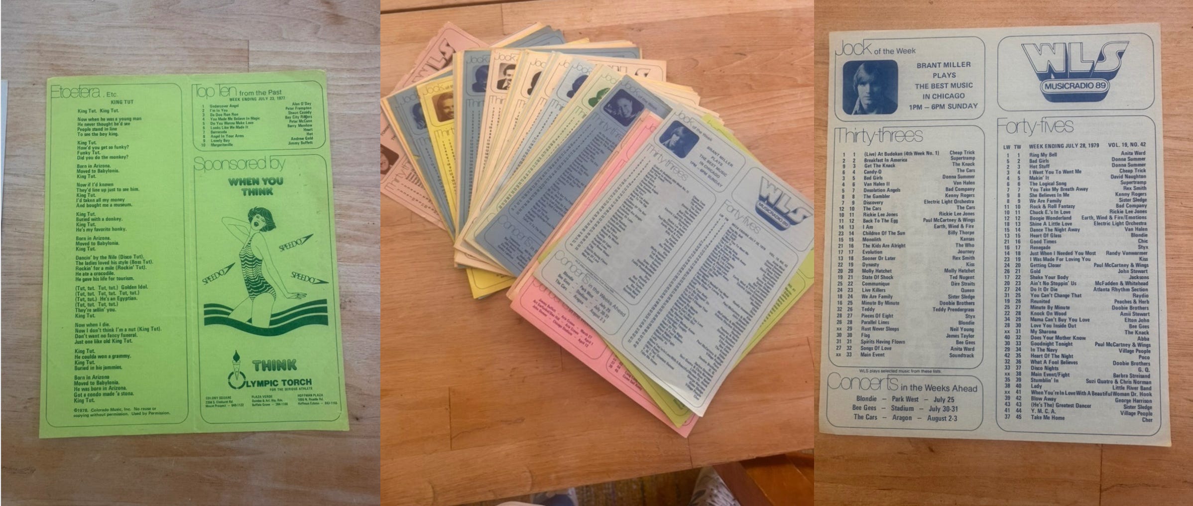 The images above are a paper trail of memory from that time in Chicago. What you see here are just some of the 63 leaflets I lovingly collected from my local record store Wally King’s, an analog archive of aching and marginalia listing the top 45s and the top 33s, along with lyrics and upcoming concerts in the area. I would loyally trudge down to Wally’s, collect my leaflet, and pore over it—who’s up, who’s down, what’s new—with the intensity of a minor league scout seeing who is ready to get called up to the majors.