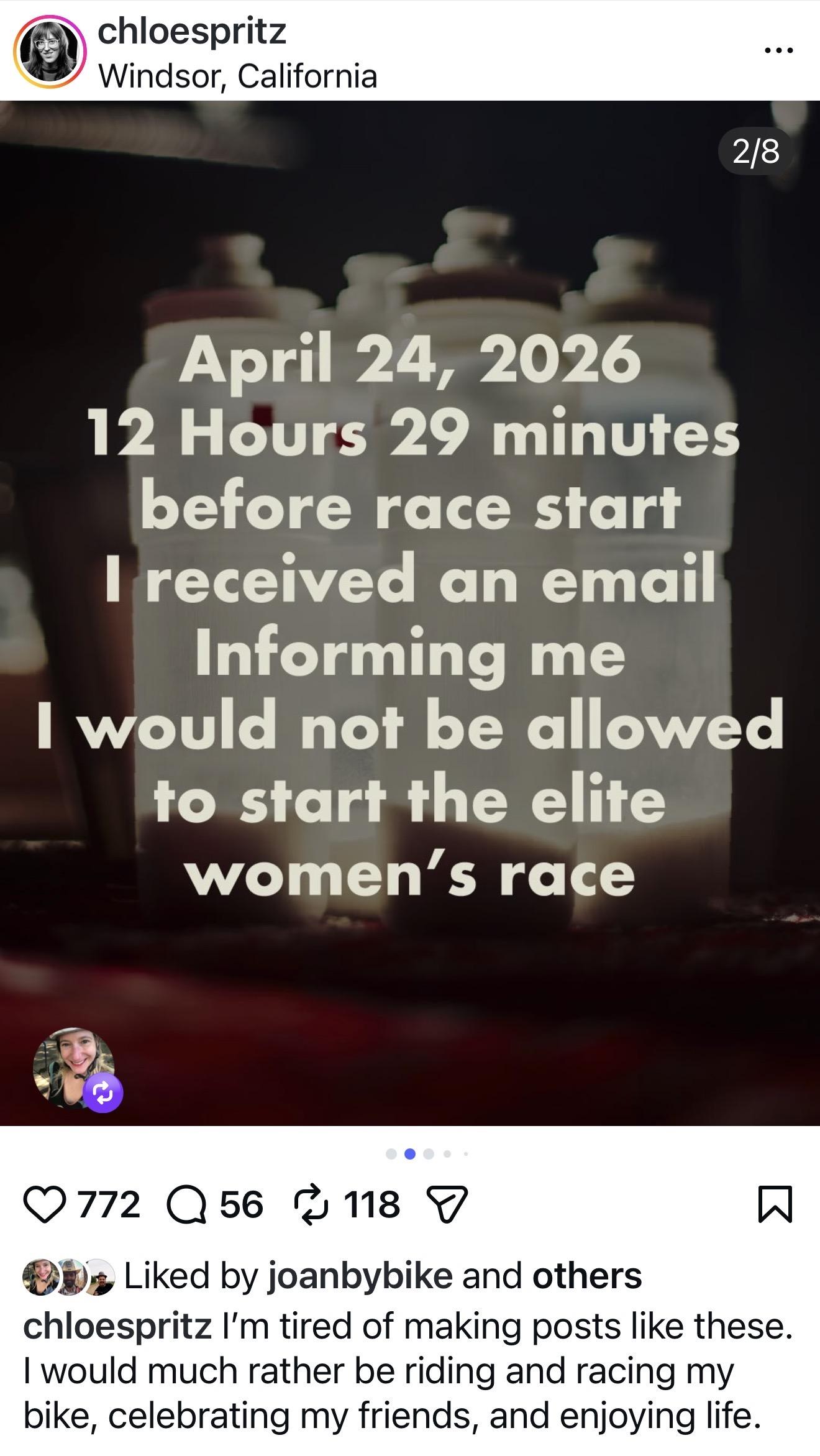 Levi’s gran fondo, a famous NorCal bike race told a local Portland transgender racer she was banned 12hr before the start. But she applied, was approved, and registered months and weeks earlier. Imagine being told the night before after driving 10hrs to CA.