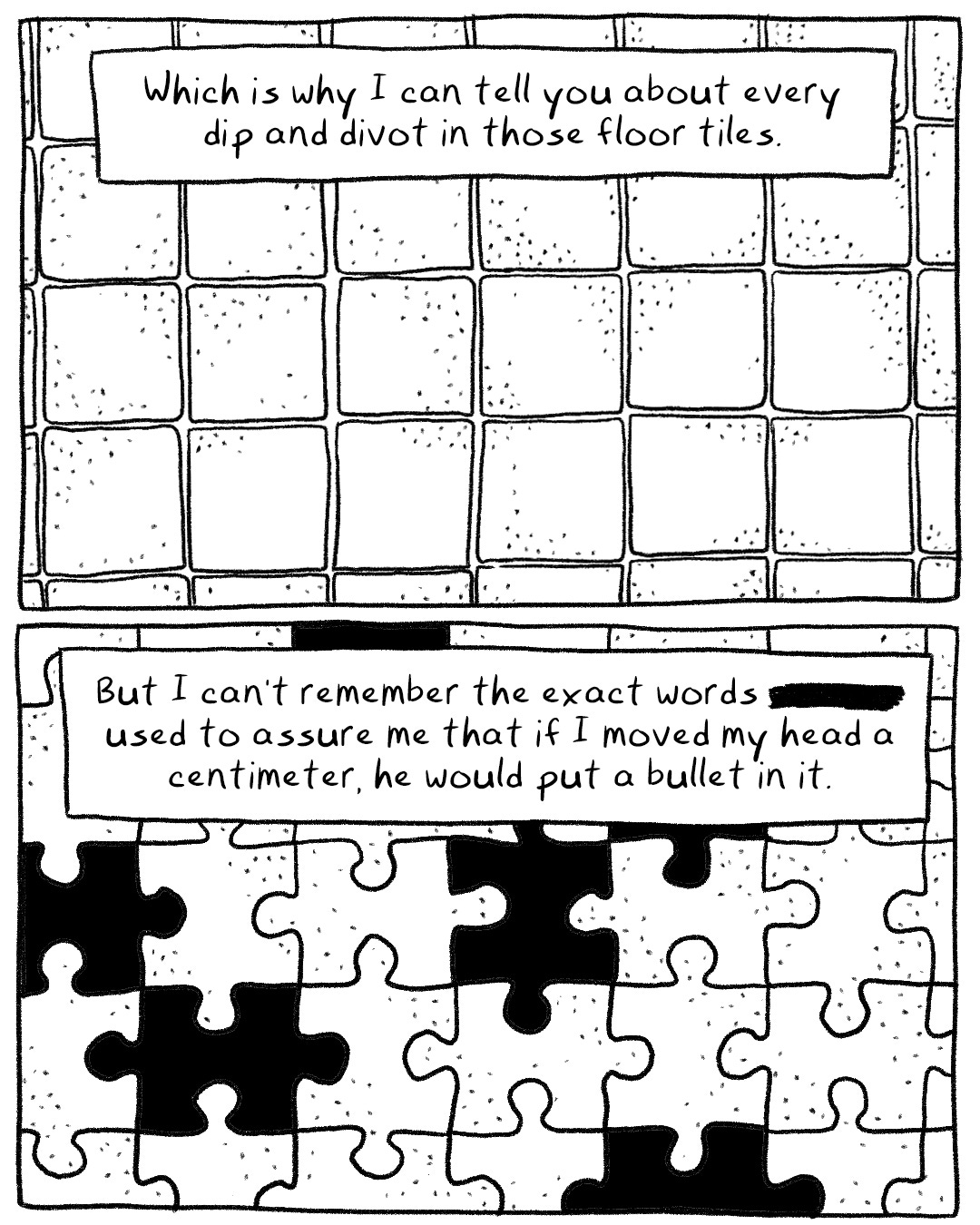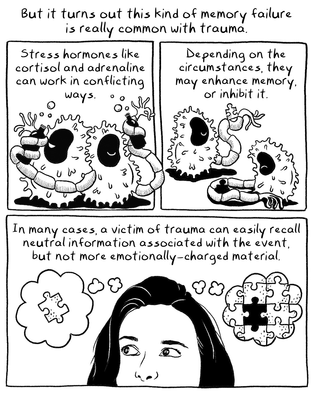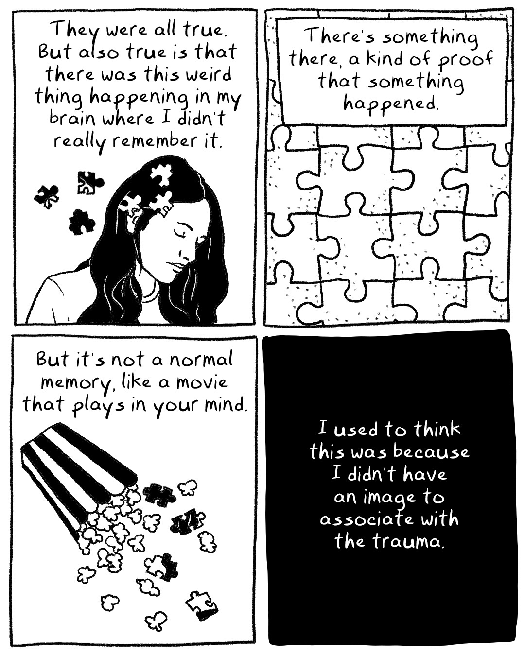The third story comes to you in a creative nonfiction class. The narrator gets very drunk at a party. She kisses one guy and another kisses her. She runs away and bumps into an acquaintance, who she barely recognizes through a haze of cheap beer. He is aggressive, putting his penis inside of her while she tries to stammer, “wait, wait.”