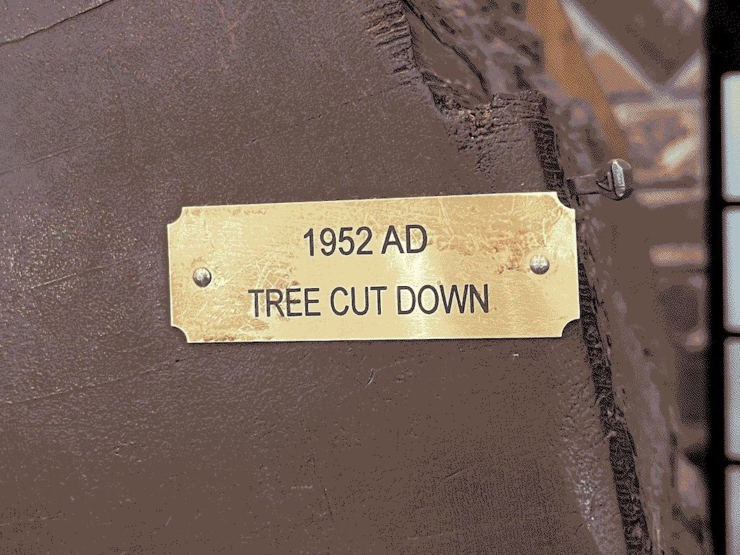 Fitting with the unspecified but palpable Biblical mood of the place, the tree’s rings were marked with the birth of Jesus, the fall of the Roman Empire, a long, unremarked-upon Dark Ages, American Independence and the death of the tree itself.