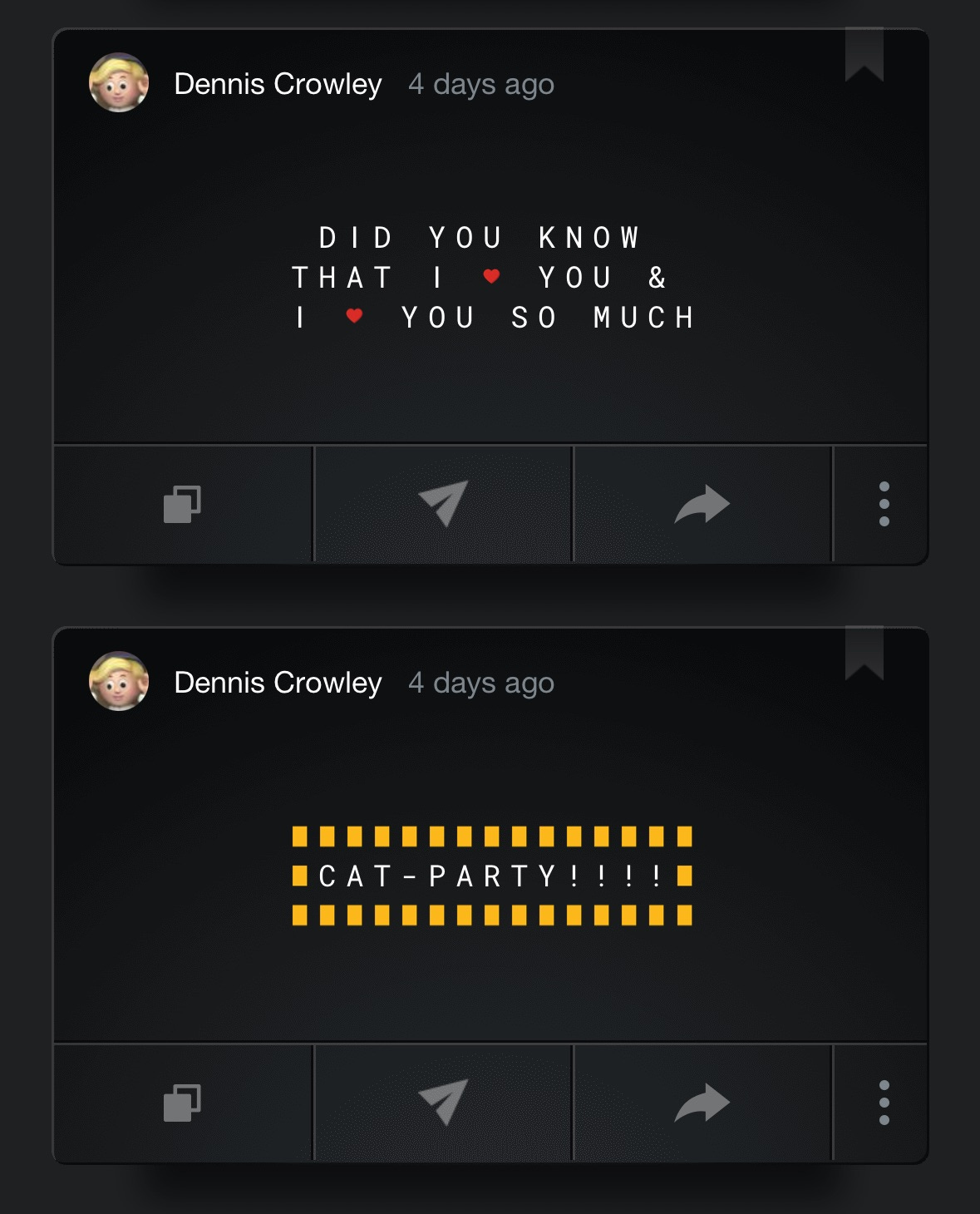 From the Vestaboard app… one was from me, one was from Mars’ .. can you guess? :)