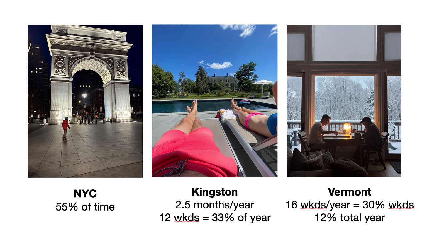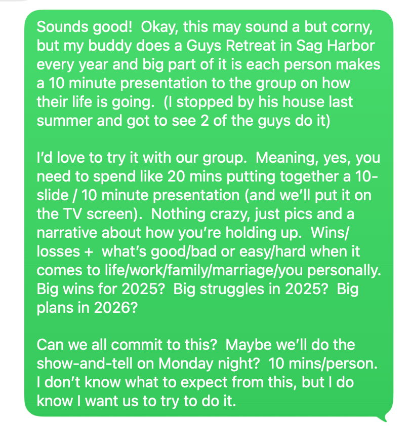 Guys Retreat – Back in January we did a Guys Retreat in VT (in lieu of doing an expensive ski trip, flights, hotel, etc). There were 5 of us (and 2 buddies flew up from ATL). As part of it, I asked each person to put together a 10 minute slide deck on “how your life is going — the good, the bad, wins vs losses, hopes & dreams” (yes, like a Keynote deck w/ photos) and it was AWESOME. Most of “The Presentations” ended up going 30+ mins, with Q&A at the end, and everyone tilted towards “oversharing” (and emotionally vulnerability!) vs. undersharing / brushing off hardships, etc. We spread them out over a few days — usually 1-2 in the morning before going out to ski, and one at night/apres ski. I highly recommend this exercise for anyone reading (you could prob do as a one-day thing too). Btw, I got this idea from my buddy Rufus (whose been doing it with his buddies for 10+ years). Here’s the outline I shared w/ the guys ahead of time for guidance structure (even tho we all deviated from it … my deck was like 76 slides of photos. 76 slides in ~30 mins)