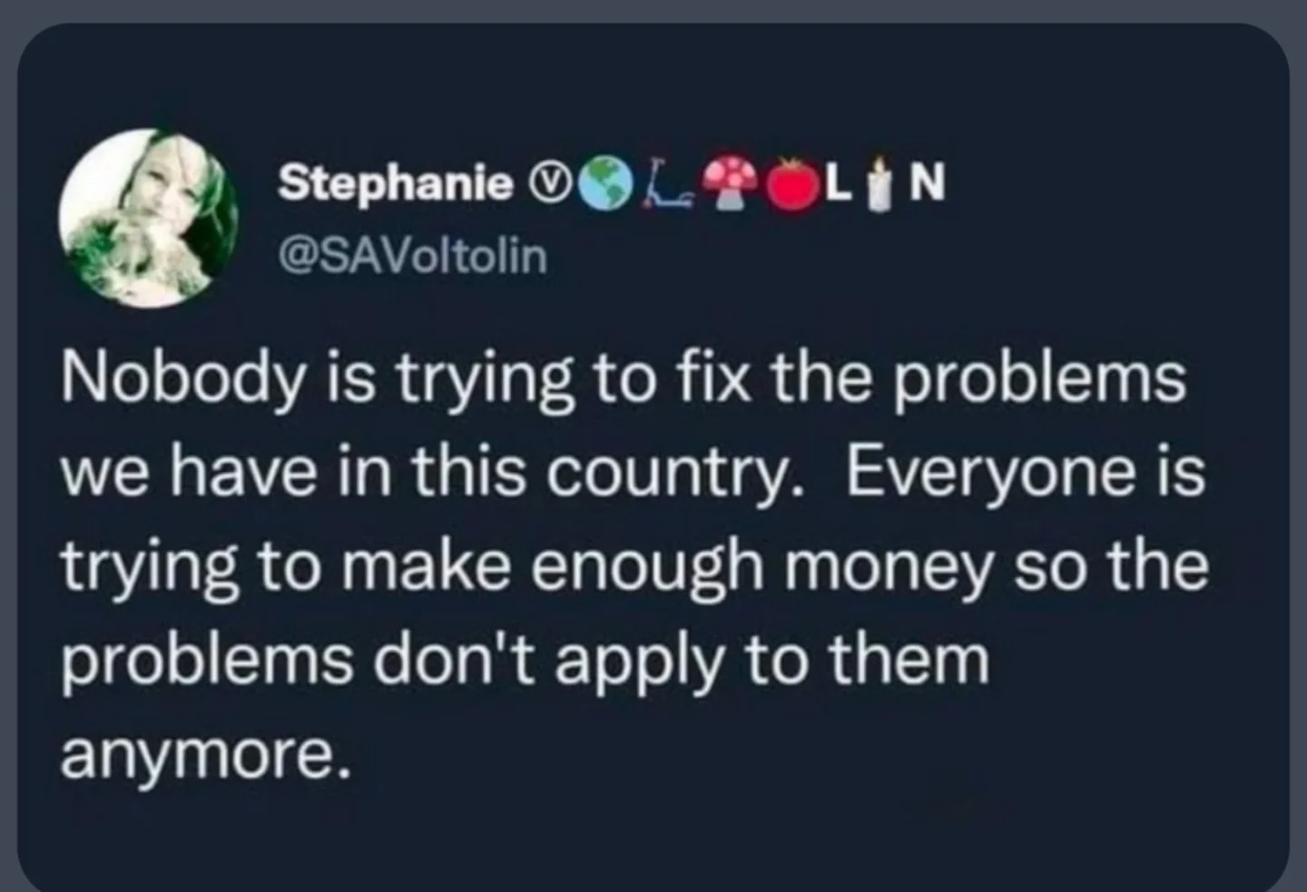 “We are a society defined by two objects, phones and guns. With your phone, you can see exactly how well people are living who are not you. You are surrounded all day by people who have it better than you in imagery and in videos. And with guns, you could do something about it.” – chilling quote from the latest Plain English podcast on AI vs. jobs. (great listen btw)