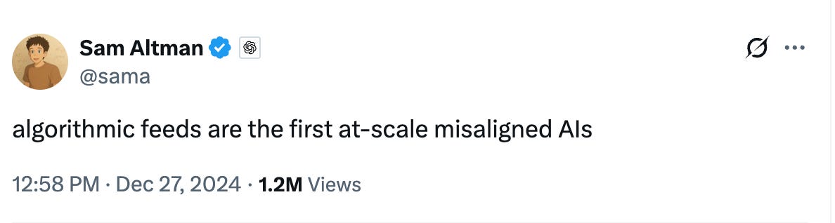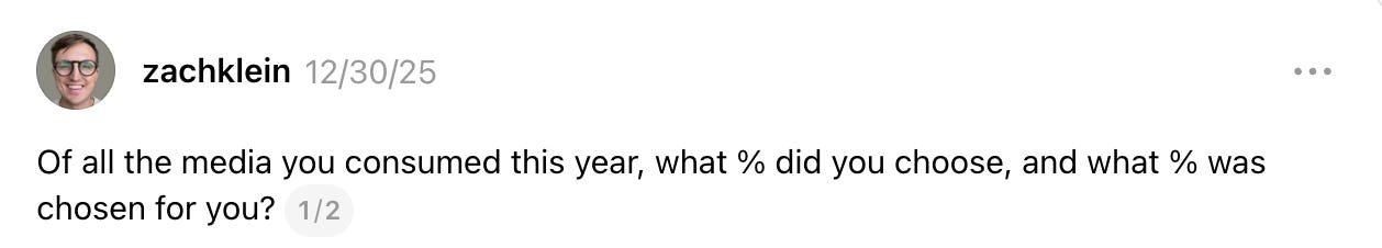 … I think I could write a whole newsletter on this, but forget content from algo-feeds (Reels, Threads, etc) but think of the things like books / articles / TV shows that you LEARNED ABOUT from those algo feeds… what % of those things you consumed only got to you because of an algo? e.g. Would you have read that book if the algo didn’t show you the the tweet that referenced it?