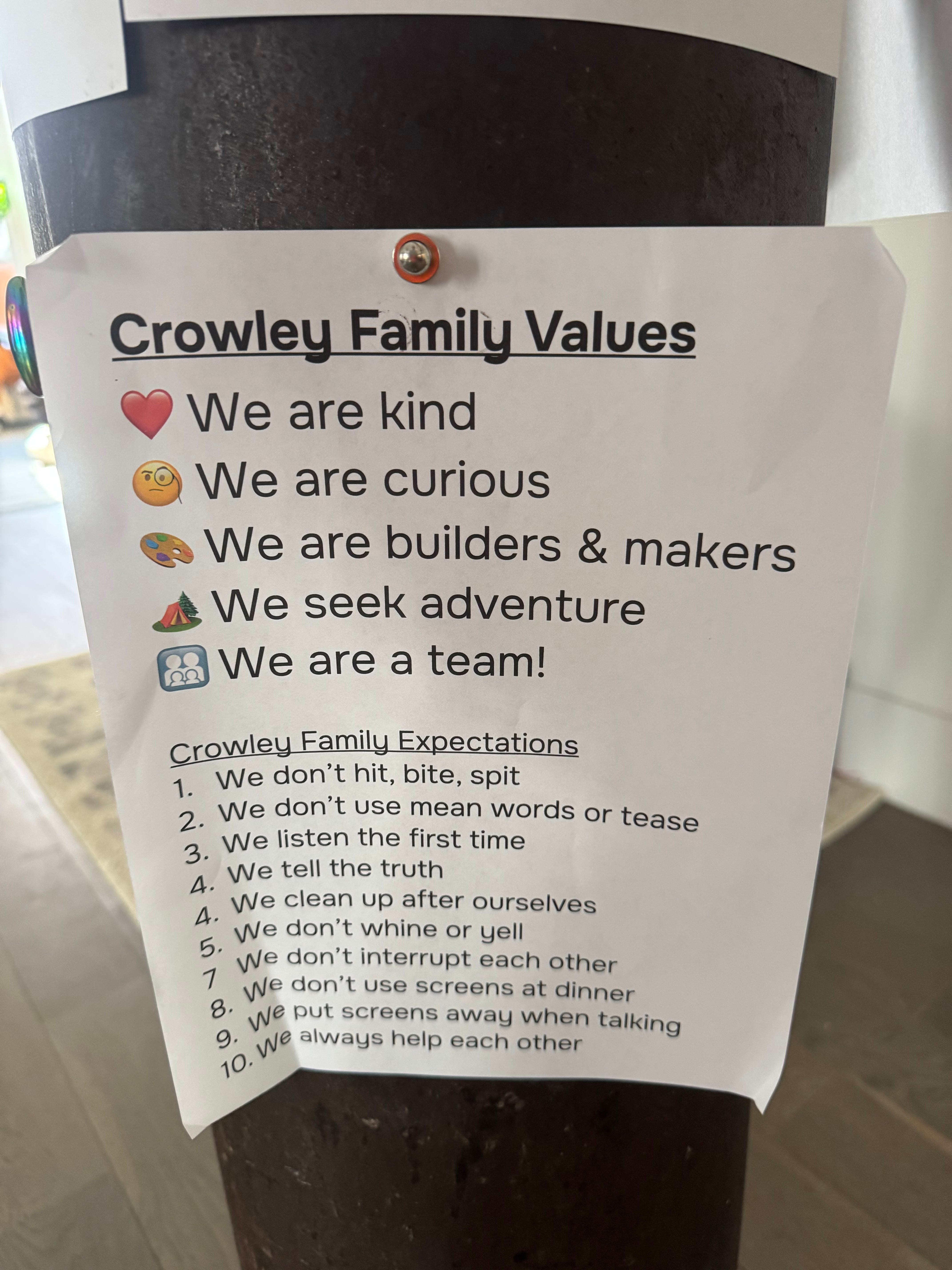 Family Values – Been working to be a bit more, er, intentional about What Does Our Family Believe in. Think: “Core Values” but for family (vs. company). Here’s our v1. We refer to this regularly when kids are acting up / complaining, etc.