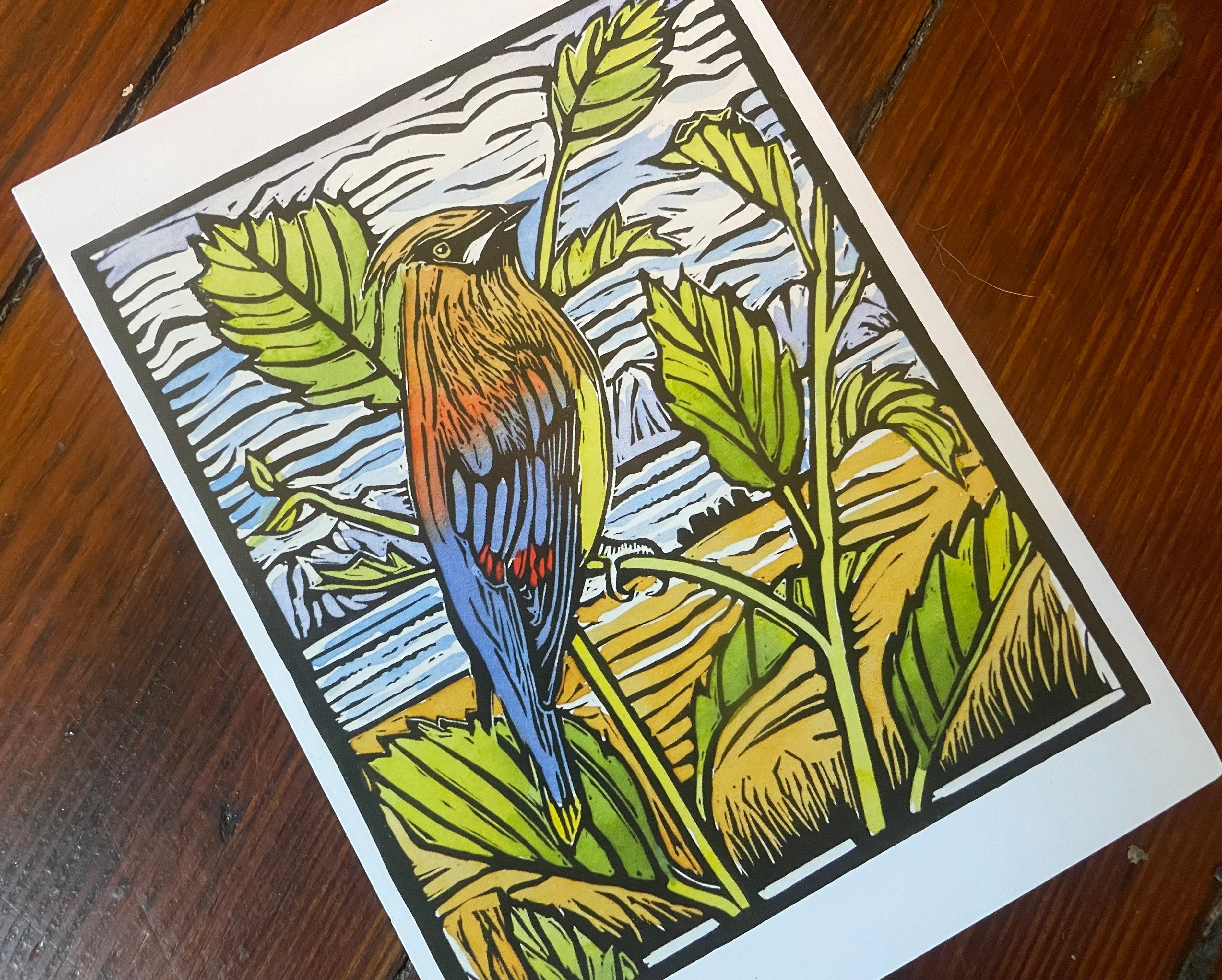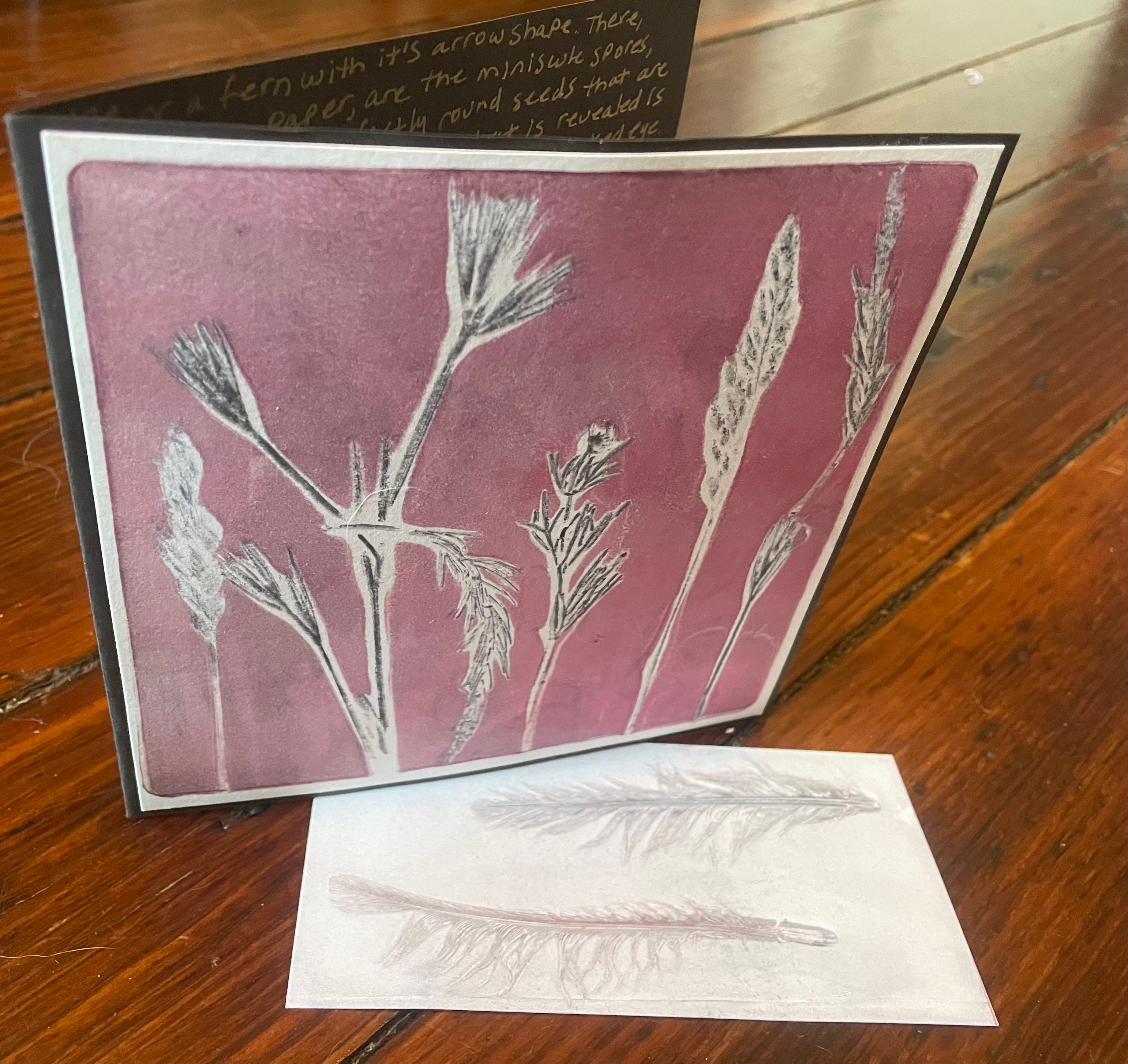 From Gillian, who wrote a great note about making monoprints of leaves, feathers, petals, etc., and how seeking the rights subjects takes observation; the process reveals what the naked eye missed; and that informs the next subject. Says Gillian: “Noticing, I have found, is never complete.”
