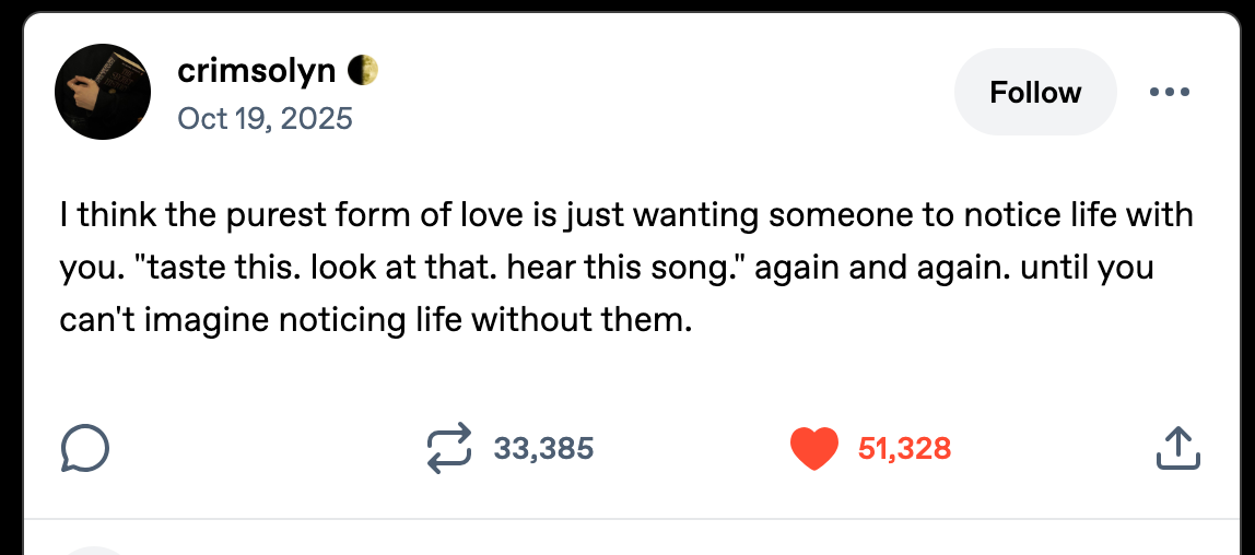 To be clear, I am not saying that all good gifts are handmade or cheap, found or free. A gold necklace for a grandmother, with one sparkling birthstone symbolizing each of her grandchildren, might be a home run gift. What the gold necklace and [something like a simple snail-shell necklace from a high school sweetheart] have in common is thoughtfulness, which includes thinking critically and creatively about the role of money in our gestures of care. We can call industrial capitalism’s bluff even while participating in monetary exchange, reining in consumerism-run- amok and the way it eclipses the world’s true offerings. Swapping in richness for riches, we can reclaim our attention and our agency at once. The amount on the price tag is far from the full story. A good gift is always priceless, at least to the recipient. A gift can leave a recipient feeling flush because it references a shared memory or inside joke, sparks their intellect, attends to beauty, makes them feel safe, honors their past, encourages their future, celebrates their present — or for many other reasons. When I am dreaming up a gift for someone, I don’t assume stores are the only places to find ingredients to activate such a rich experience for my recipient. Indeed, many of the most wonderful phenomena are too big or too small — too fleeting or too slow, too alive or too wild — to pin down, package up, and sell. “Thank God for the things that I do not own,” in the words of St. Teresa of Ávila. A great gift might be borrowed instead of bought. It could merely be pointed at, wandered through, or gazed into. It might be hiding up in the night sky or a grandmother’s attic.