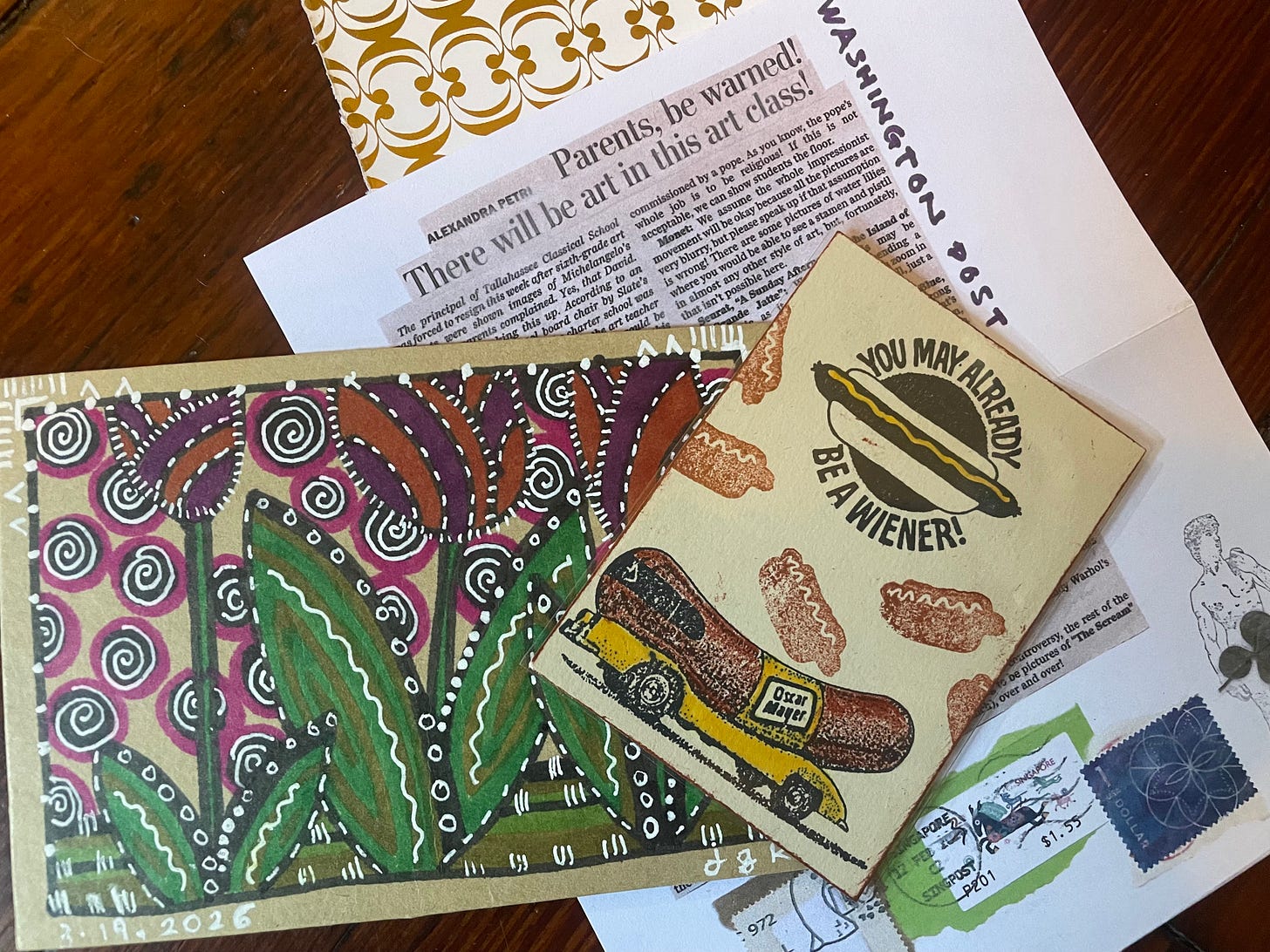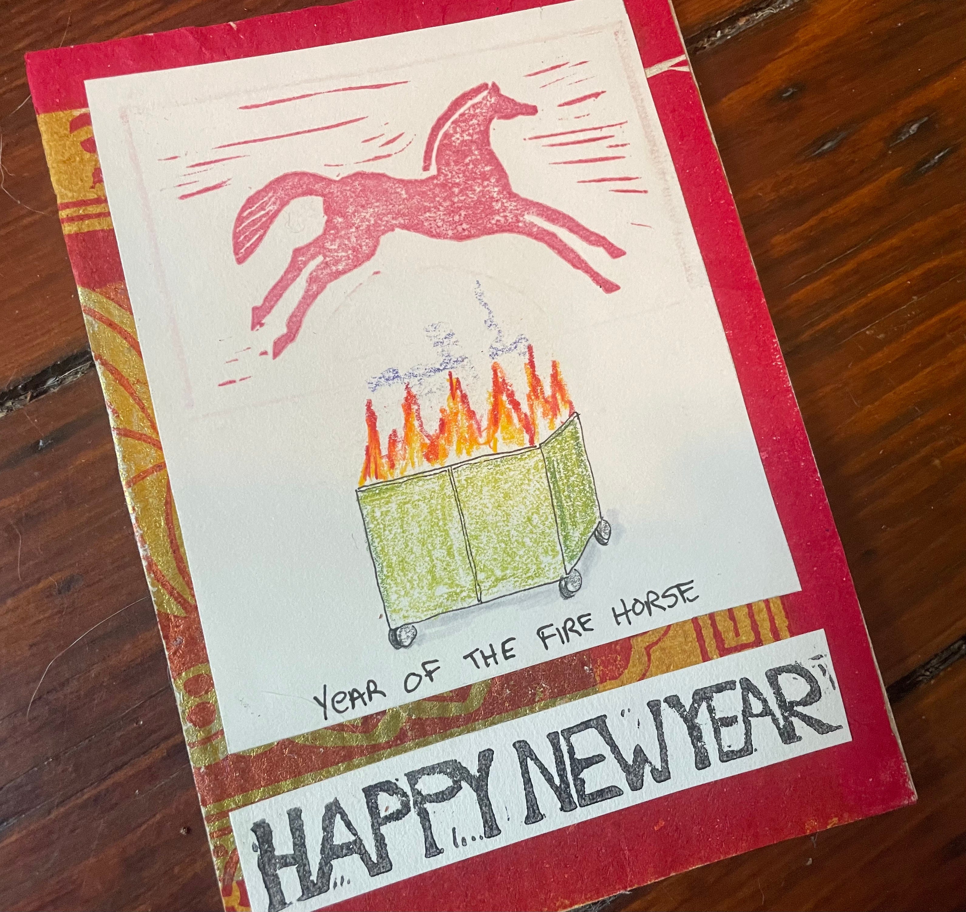 From Caryn in New Mexico, a delightful Lunar New Year linocut card! (If you’re still out there, Caryn, send me the email address you use for TAoN, consumed@robwalker.net.)