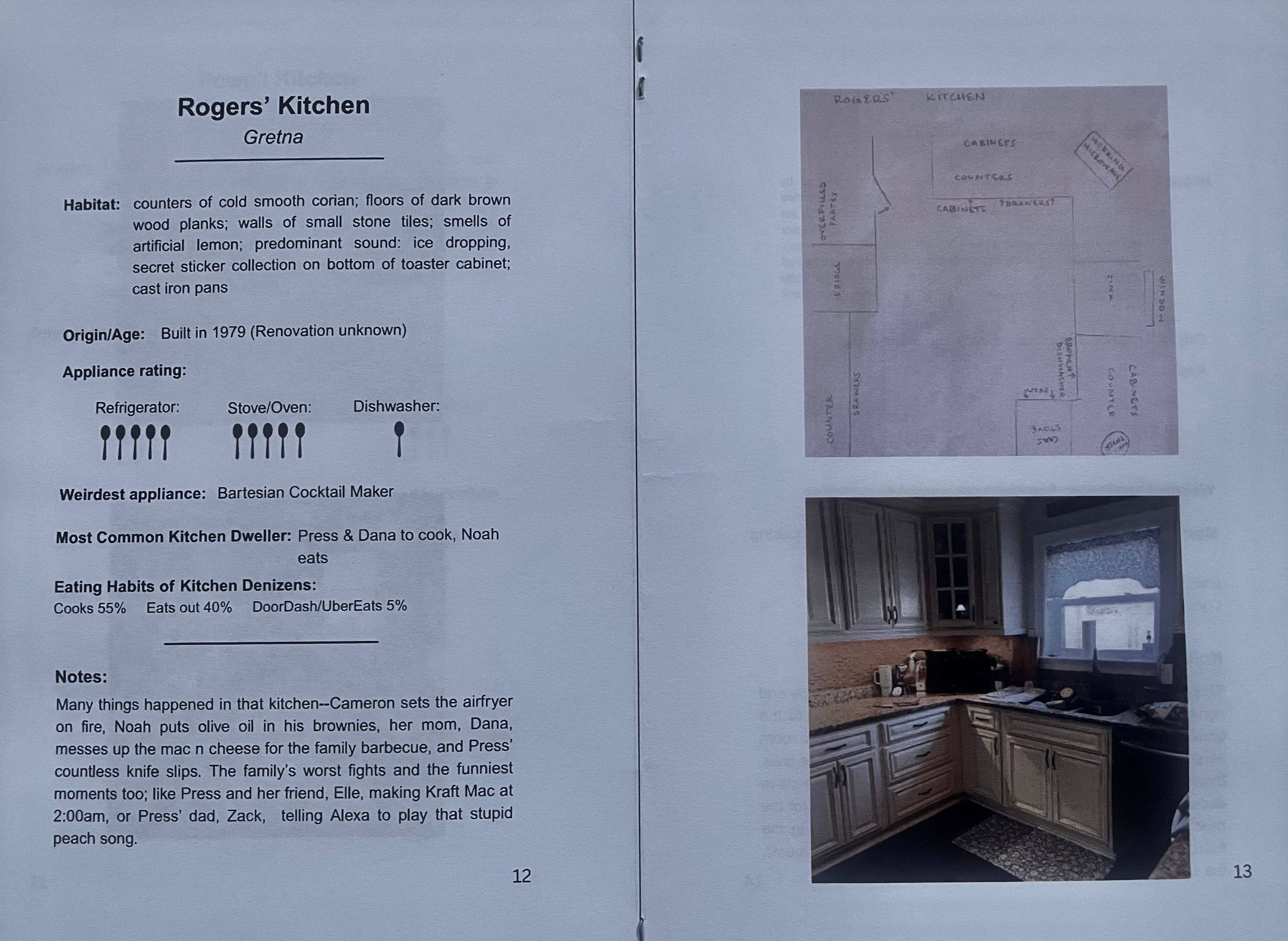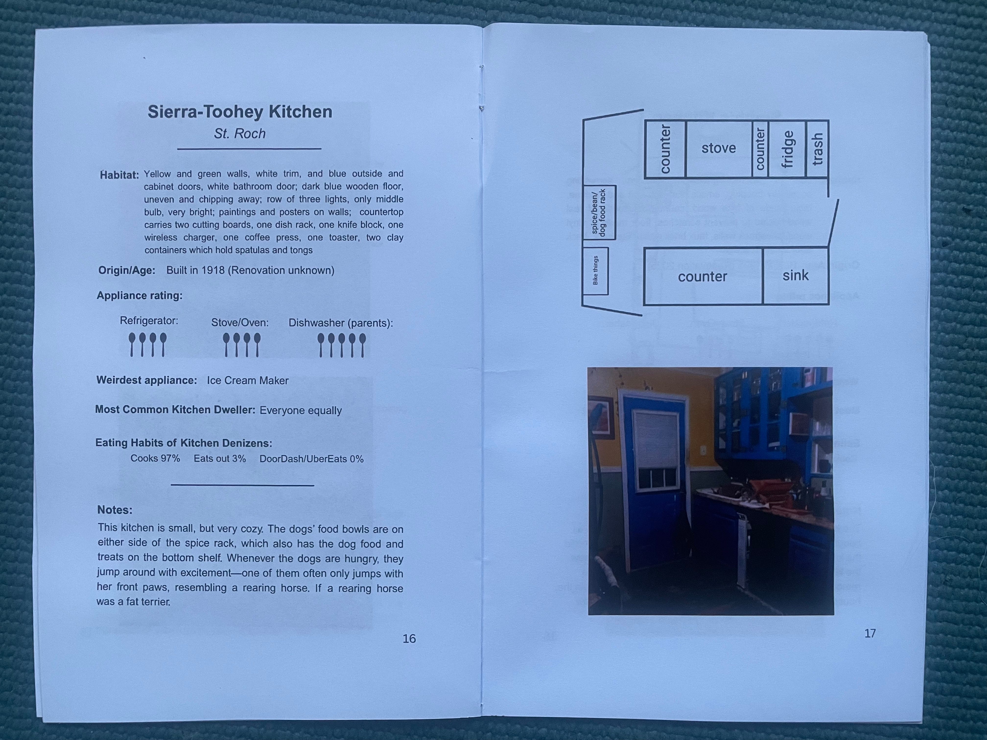 Among other things, the students pick one of the exercises in the book to inspire a creative noticing project — a zine, videos, interviews, whatever they wish — and it’s invariably impressive and fun and impressively fun. This year’s class made a “Field Guide To Area Kitchens.”
